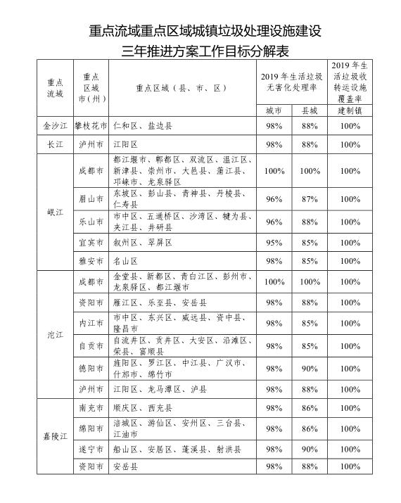 2017年4月,省政府辦公廳印發(fā)了《四川省城鎮(zhèn)污水處理設施建設三年推進方案》和《四川省城鄉(xiāng)垃圾處理設施建設三年推進方案》(川辦函〔2017〕85號,以下簡稱兩個三年推進方案),各地按照兩個三年推進方案,積極推進城鎮(zhèn)污水和城鄉(xiāng)垃圾處理設施建設,取得了積極成效。為加快推進四川省城鎮(zhèn)污水和城鄉(xiāng)垃圾處理設施建設,切實改善城鄉(xiāng)生態(tài)環(huán)境質量,更好滿足人民群眾對美好環(huán)境的需求,省政府組織住房城鄉(xiāng)建設廳對兩個三年推進方案作了修訂完善。經省政府同意,現(xiàn)將修訂后的兩個三年推進方案主要建設任務表、目標任務表、重點流域重點區(qū)域目標分解表及實施項目計劃表印發(fā)你們,并就有關事項通知如下。