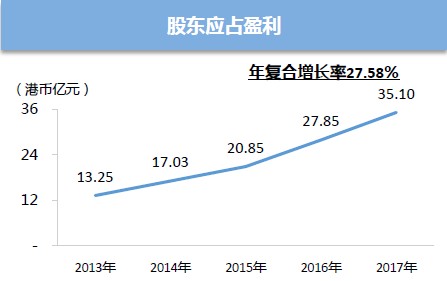 2008年至2017年,收入從19億人民幣增長(zhǎng)至201億,利潤(rùn)從3.4億增長(zhǎng)至35億,增幅都將近十倍。最近五年收入年復(fù)合增長(zhǎng)率39%,利潤(rùn)復(fù)合增長(zhǎng)率28%,能持續(xù)保持這種節(jié)湊往前增長(zhǎng)的公司,香港市場(chǎng)并不多見。
