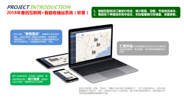 國家從2008年開始開始關注畜禽處理,2017年已經(jīng)開始形成規(guī)?;6鴧R君環(huán)能同時也從去年開始著手規(guī)劃整縣(市)資源化的處理,利用匯君模式,根據(jù)當?shù)氐膶嶋H情況,合理規(guī)劃沼氣工程中心站,另外以村鎮(zhèn)為單位、以公里半徑為單位、以養(yǎng)殖規(guī)模為單位,建立有機肥加工廠,采用智能化收儲運平臺,有效利用地方的政策,配合消納政策,實現(xiàn)全方位畜禽糞污資源化智能處理。