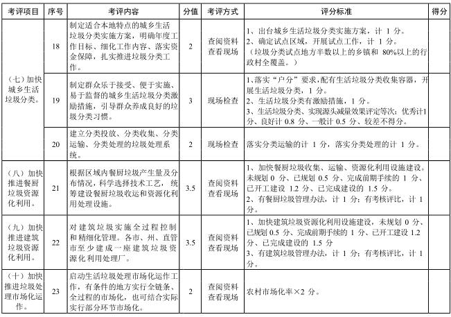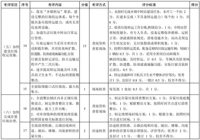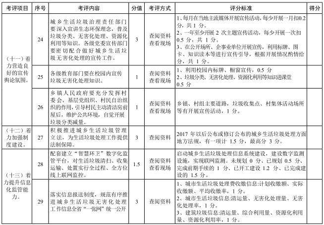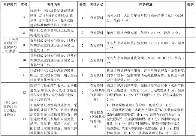 考評內(nèi)容主要根據(jù)《湖北省城鄉(xiāng)生活垃圾無害化處理全達(dá)標(biāo)三年行動實(shí)施方案》,考評以下內(nèi)容:技術(shù)支撐、運(yùn)行管理、資金保障與分擔(dān)、垃圾收運(yùn)和無害化處理設(shè)施建設(shè)、存量垃圾治理、城鄉(xiāng)生活垃圾分類、餐廚和建筑垃圾資源化利用、垃圾處理市場化運(yùn)作、輿論宣傳、制度建設(shè)以及信息化監(jiān)管等方面,考評項(xiàng)目詳見評分表。根據(jù)全省總體工作進(jìn)展情況和年度工作重點(diǎn),分年度制定具體考評內(nèi)容。