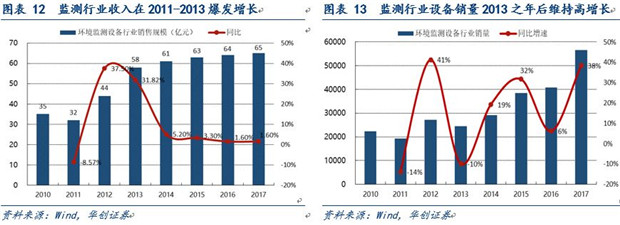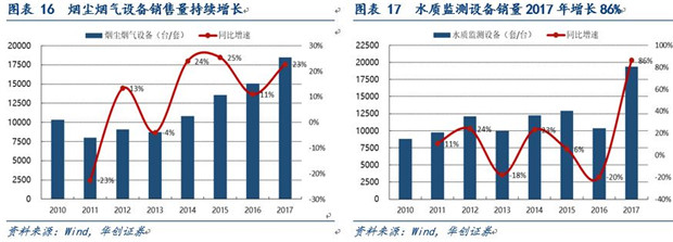 從監(jiān)測設(shè)備的細(xì)分領(lǐng)域來看,空氣質(zhì)量監(jiān)測設(shè)備歷史上經(jīng)歷了兩個高增長期,第一次爆發(fā)性增長為2011-2012年,復(fù)合增速高達(dá)197.3%,第二次出現(xiàn)在2015年,增速為161.7%,這次增長的主要原因是2016年1月1日后要實施修訂后的《中華人民共和國大氣污染防治法》,其中規(guī)定各省大氣污染防治重點(diǎn)任務(wù)完成情況將納入考核,刺激政府需求;此外煙塵煙氣設(shè)備行業(yè)則是從2011年開始維持穩(wěn)定的增長持續(xù)到2017年,期間復(fù)合增長率14.9%;水質(zhì)監(jiān)測設(shè)備行業(yè)發(fā)展較晚,在2017年設(shè)備銷量猛增86%,達(dá)到19345套。