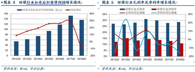 2018Q3,環(huán)保上市公司營業(yè)總收入為1369.04億元,同比增加83.37億元,增幅6.48%,增速與去年相比大幅回落。歸屬于母公司的凈利潤147.77億元,同比減少17.67億元,下降10.68%??鄢墙?jīng)常性損益后的歸母凈利潤共136.04億元,同比減少16.05億元,下降10.55%,與去年同期28.61%的增幅相比大幅下跌。行業(yè)整體毛利率為28.51%,同比增加2.62個百分點(diǎn),在近幾年毛利率下滑的趨勢中有所回升,但整體凈利率為10.79%,同比減少16.12個百分點(diǎn),說明毛利率的回升沒有帶來凈利率的增加。