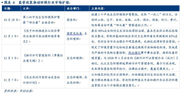 10月29日中央生態(tài)環(huán)境保護(hù)督察“回頭看”全面啟動,延續(xù)第一批環(huán)保督察“回頭看”的高壓特征,嚴(yán)監(jiān)管有利于環(huán)保需求進(jìn)一步釋放。隨后11月5日《排污許可管理條例(草案征求意見稿)》的出臺也意味著環(huán)保標(biāo)準(zhǔn)提高、監(jiān)管趨嚴(yán)。而11月7日出臺的《農(nóng)業(yè)農(nóng)村污染防治攻堅戰(zhàn)行動計劃》中提出到2020年要實現(xiàn)“一保兩治三減四提升”的總目標(biāo),進(jìn)一步釋放環(huán)保行業(yè)的市場空間。