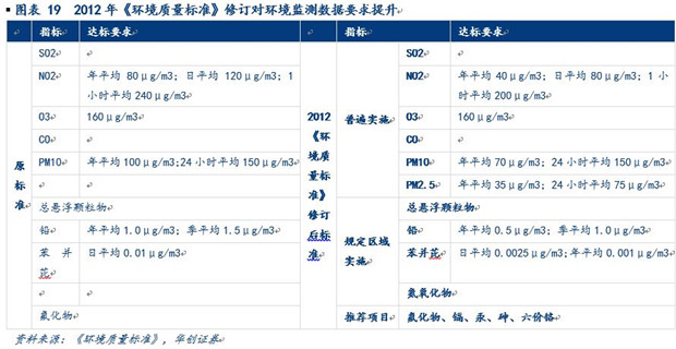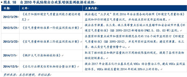 對監(jiān)測數(shù)據(jù)要求提升從政策看來主要表現(xiàn)在兩個方面:(1)擴(kuò)大監(jiān)測指標(biāo)范圍+縮緊合格要求。早在2012 年環(huán)保部頒布新版《環(huán)境空氣質(zhì)量標(biāo)準(zhǔn)》中普遍實施的指標(biāo)中新增PM2.5,部分區(qū)域?qū)嵤┑闹笜?biāo)中新增了氮氧化物,并新增推薦項目鎘、汞、砷、六價鉻,擴(kuò)大了環(huán)境監(jiān)測數(shù)據(jù)的覆蓋范圍;同時對NO2、PM10、鉛、苯并芘等已有監(jiān)測指標(biāo)的合格要求也變得更加嚴(yán)格。而該標(biāo)準(zhǔn)的實施細(xì)則在2013年3月頒布并廣泛實行。2014年又進(jìn)一步出臺對大氣和石化行業(yè)的細(xì)分要求,提高對排放限值的規(guī)定。(2)管理+采集雙管齊下提升數(shù)據(jù)真實性。自2012年出臺的《關(guān)于加強(qiáng)環(huán)境空氣質(zhì)量監(jiān)測能力建設(shè)的意見》開始提出要通過健全審核機(jī)制、提高公布數(shù)據(jù)的頻率等管理手段來加強(qiáng)環(huán)境監(jiān)測數(shù)據(jù)的有效性,提出共享數(shù)據(jù)的概念,并制定“三步走”的執(zhí)行方案,系列政策一直持續(xù)到2013年底。