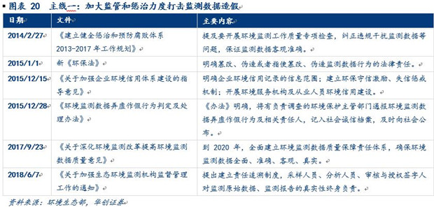 第三階段:政策推動集中打擊監(jiān)測數(shù)據(jù)造假。2015年以來,整體上監(jiān)測設(shè)備廣泛布局和補(bǔ)充升級的過程已經(jīng)基本結(jié)束,后續(xù)增長有限,實施執(zhí)行過程中暴露出篡改、虛報數(shù)據(jù)等諸多問題才是該階段的主要問題,因而規(guī)范監(jiān)測數(shù)據(jù)、打擊數(shù)據(jù)造假成為本階段主題。從政策來看,打擊數(shù)據(jù)造假的執(zhí)行過程中有兩條主線:第一條主線貫穿始終,從2015年1月1日《新環(huán)保法》頒布以來,又陸續(xù)出臺實施指導(dǎo)意見通過明確責(zé)任、建立懲罰機(jī)制加大監(jiān)測數(shù)據(jù)造假的成本,用嚴(yán)監(jiān)管的方式打擊監(jiān)測數(shù)據(jù)造假;第二條主線則是對主線一的補(bǔ)充和優(yōu)化,從2015年8月開始,通過監(jiān)測事權(quán)上收、調(diào)整監(jiān)管體系架構(gòu),從根源上用疏通的方式來避免監(jiān)測數(shù)據(jù)造假的問題。