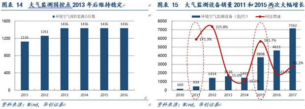第一階段:建設(shè)監(jiān)測體系,國控點(diǎn)、省控點(diǎn)等大型監(jiān)測設(shè)備廣泛布局。第一階段從2011年開始到2013年結(jié)束,首先這是環(huán)境監(jiān)測行業(yè)在各省市普及化布局監(jiān)測點(diǎn)位,集中發(fā)展的重要階段。從監(jiān)測行業(yè)營收來看,行業(yè)銷售規(guī)模從32億元猛增到58億元,兩年內(nèi)的同比增速在30%以上,復(fù)合增速高達(dá)34.6%,而期間監(jiān)測設(shè)備銷量的增長率為12.8%,該階段主要由于采購的主要為大型監(jiān)測站,價值量較高,所以營收增速高于設(shè)備銷售增速;隨著2013年大型監(jiān)測站基本布局完成,大氣監(jiān)測國控點(diǎn)的數(shù)目基本穩(wěn)定在1436個,此后監(jiān)測設(shè)備銷售主要用于補(bǔ)充配置,銷量增速高于行業(yè)營收增速。