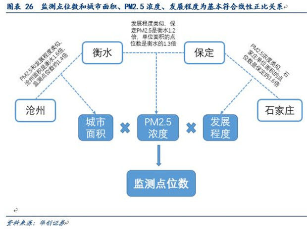 從布點(diǎn)的個數(shù)來看,污染嚴(yán)重、面積大、經(jīng)濟(jì)發(fā)達(dá)的地級市布點(diǎn)更為密集。以河北為例,滄州市和衡水市的污染程度差不多,同作為非省會的地級市發(fā)展程度也類似,而滄州市的面積是衡水的1.6倍,而滄州的監(jiān)測點(diǎn)位數(shù)為衡水的近1.4倍,所以可以認(rèn)為布點(diǎn)個數(shù)和面積基本為線性正比;而比較保定市和衡水市,保定市是衡水市面積的2.5倍,發(fā)展程度相似,但折算后的單位面積的點(diǎn)位數(shù)保定仍是衡水的1.3倍,這是因為保定的PM2.5濃度是衡水的1.2倍,所以可以認(rèn)為監(jiān)測點(diǎn)位數(shù)和PM2.5濃度基本符合線性正比關(guān)系;而對于保定和石家莊,兩者的污染程度類似,保定市的面積是石家莊的1.6倍,但布局的監(jiān)測點(diǎn)位數(shù)差不多,可以發(fā)現(xiàn)經(jīng)濟(jì)發(fā)達(dá)地區(qū)/省會城市的網(wǎng)格化監(jiān)測點(diǎn)位數(shù)會存在一個放大倍數(shù)。