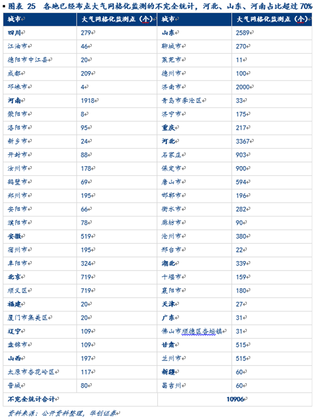 2017 年以來我國大氣網(wǎng)格化監(jiān)測訂單總額超過7億元,招標(biāo)主體涉及河北、河南、山東、陜西、天津、福建、廣東、廣西、安徽、四川、江蘇、甘肅、湖北、新疆與遼寧這 15 個省級行政區(qū),39個地級市。經(jīng)不完全統(tǒng)計全國大氣網(wǎng)格化監(jiān)測布點(diǎn)10906個,其中河北、山東、河南布點(diǎn)數(shù)目全國前三,涉及23個城市,合計7874個點(diǎn)位,占全國總布點(diǎn)數(shù)目70%以上。而且三大省份已經(jīng)布局的這23個城市中有18個都屬于《京津冀及周邊地區(qū)2017年大氣污染防治工作方案》中明確的“2+26”通道城市,其中河北省的8個通道城市,石家莊、唐山、廊坊、保定、滄州、衡水、邢臺、邯鄲全部實現(xiàn)網(wǎng)格化監(jiān)測覆蓋;山東省的7個通道城市中,濟(jì)南、濟(jì)寧、德州、聊城已經(jīng)布點(diǎn)并統(tǒng)計在內(nèi),淄博已經(jīng)完成布點(diǎn)但沒有準(zhǔn)確數(shù)據(jù),濱州和菏澤在尚布局中;河南省的7個通道城市中,鄭州、開封、安陽、鶴壁、新鄉(xiāng)、濮陽已經(jīng)完成布點(diǎn),只有焦作尚在布局中。外加北京、天津、山西省的太原和晉城也完成網(wǎng)格監(jiān)測點(diǎn)布局,“2+26”城市中有22個已經(jīng)布點(diǎn),基本實現(xiàn)了城市的覆蓋,但從布點(diǎn)數(shù)量來看河北廊坊市、山東濟(jì)寧市、聊城市、河南省各市以及天津只是剛剛開始,這些城市離布局完成還有近80%的空間。