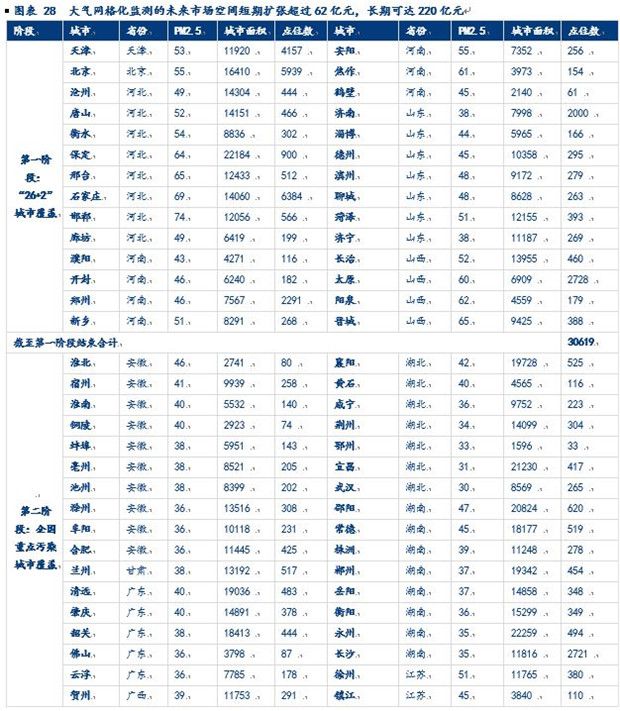 大氣網(wǎng)格化監(jiān)測布點(diǎn)從“26+2”城市開始,并從重污染地區(qū)向輕污染地區(qū)延伸的拓展,直到覆蓋全國。第一階段是“26+2”城市覆蓋階段,預(yù)計總共布點(diǎn)約30619個,形成30億左右的市場;第二階段是全國重點(diǎn)污染城市覆蓋階段,預(yù)計點(diǎn)位91943個,市場空間擴(kuò)張到92億元;第三階段是全國337個地級市全覆蓋階段,預(yù)計點(diǎn)位220758個,市場空間超過220億元。