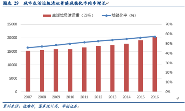 我國生活垃圾收運(yùn)處理量同城鎮(zhèn)化率具備明顯的正向關(guān)系。隨著城鎮(zhèn)化率水平的提升,我國城市生活垃圾量穩(wěn)步增加。根據(jù)歷年住建部發(fā)布的《城鄉(xiāng)建設(shè)統(tǒng)計年鑒》:自2007年至2016年間,城鎮(zhèn)化率提高11個百分點(diǎn)至57.35%;2016年全國城鎮(zhèn)生活垃圾清運(yùn)量高達(dá)20362萬噸,相比2007年城鎮(zhèn)生活垃圾清運(yùn)量的15215萬噸增加了33.82%,年均復(fù)合增長率約為3.29%。