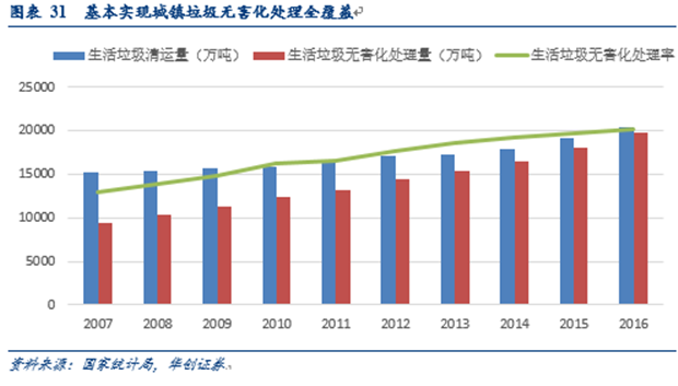 就當(dāng)前而言,我國城鎮(zhèn)垃圾無害化處理率超過95%,絕對量持續(xù)增長。2016年,我國2.03億噸城市垃圾清運(yùn)量中,無害化處理1.97億噸,占比96%,無害處處理率同比提升1個點(diǎn)。預(yù)期未來城市垃圾無害化處理率將繼續(xù)維持在高水平。