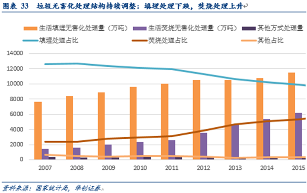 歷史上來看,填埋一直是主流模式,但近年來,填埋處理的垃圾占比持續(xù)下跌,從2007年的81%降至2016年的60%;焚燒處理的垃圾占比總體呈上升趨勢,從2007年的15%上升至2016年的37%。