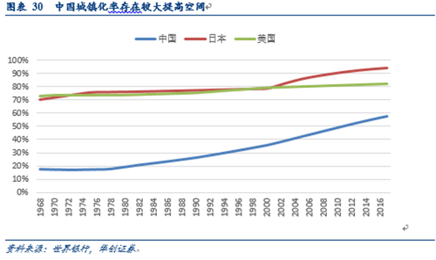 對比發(fā)達(dá)國家,我國城鎮(zhèn)化率仍有較大的差距。2017年,我國城鎮(zhèn)化率僅為58.52%,與發(fā)達(dá)國家普遍80%以上的城鎮(zhèn)化率相比,提高空間較大。