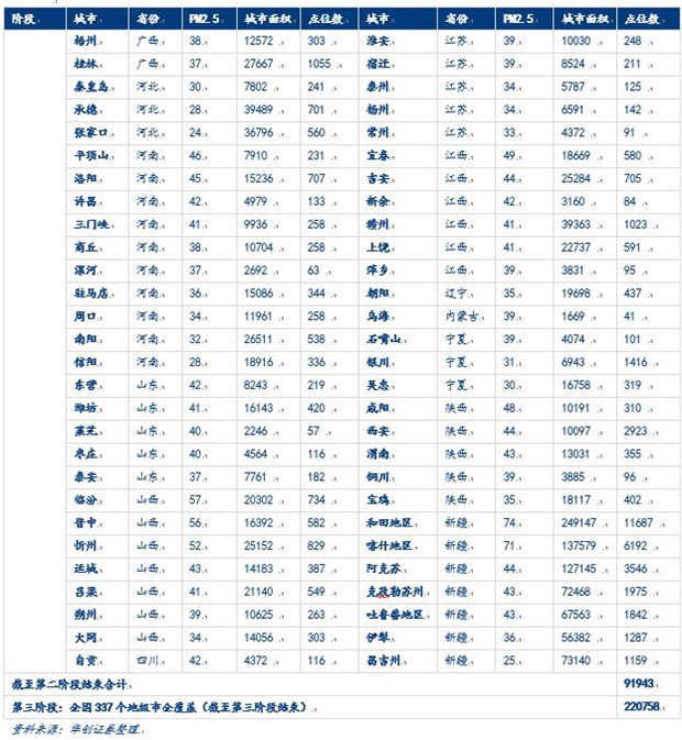 第二階段是全國重點(diǎn)污染城市覆蓋階段,覆蓋①重度污染省份的所有地級市②中度污染省份中污染程度前50%的所有地級市③所有PM2.5(從大到?。┡琶耙话俚某鞘?;