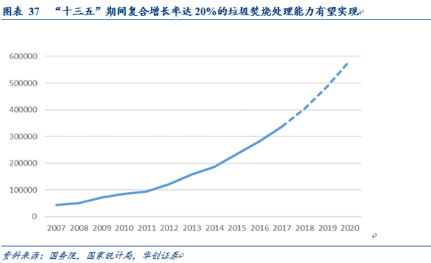 根據(jù)《“十三五”全國城鎮(zhèn)生活垃圾無害化處理設(shè)施建設(shè)規(guī)劃》,到2020年底全國城鎮(zhèn)生活垃圾焚燒處理設(shè)施能力占無害化處理總能力50%以上,其中東部地區(qū)占60%以上。2016年底,我國城市垃圾焚燒處理能力為25萬噸/日,而根據(jù)規(guī)劃2020年垃圾焚燒處理能力須達(dá)到59萬噸/日,為達(dá)到這一目標(biāo),“十三五”期間,生活垃圾焚燒處理能力年復(fù)合增長率最低須達(dá)到20%的增速。