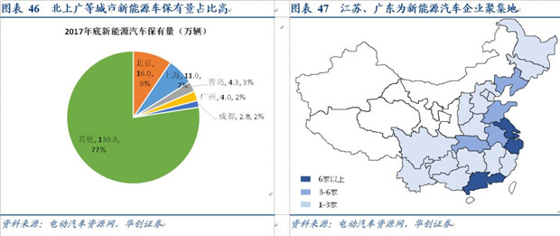 目前國內(nèi)新能源汽車的制造企業(yè)和推廣政策集中在上海、江蘇、廣東等東南部地區(qū),而發(fā)達(dá)的一二線城市仍占據(jù)新能源汽車保有量前列。截至2017年底,以北上廣等為代表的前五城市新能源汽車保有量約為38.1萬輛,占全國153萬輛的23%。同樣地,動力電池的回收渠道方面同樣呈現(xiàn)較強(qiáng)的區(qū)域性,且產(chǎn)能分布與能源汽車推廣地區(qū)的重合度也相對較高。由于在回收過程中運(yùn)輸、處理等環(huán)保要求高,因此目前行業(yè)內(nèi)的龍頭企業(yè)主要通過自建生產(chǎn)線、并購和與上下游合作等多種方式在前端渠道(即回收端)和后端渠道(即回收產(chǎn)物的下游利用端)進(jìn)行拓展,從而提高區(qū)域覆蓋面。其中,以光華科技、格林美等為代表的企業(yè)利用主業(yè)優(yōu)勢,從供給和需求兩段提早布局,一方面拓寬前端回收渠道的覆蓋地域,另一方面通過自建生產(chǎn)線擴(kuò)充產(chǎn)能,并與利用企業(yè)簽訂戰(zhàn)略合作協(xié)議等方式保障下游需求順暢。