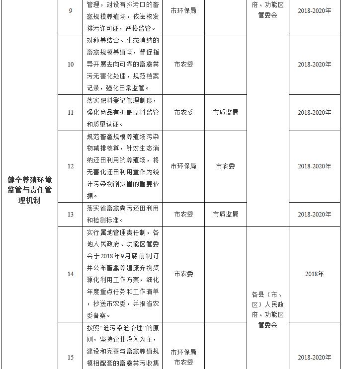 (九)堅(jiān)持屬地責(zé)任管理。畜禽養(yǎng)殖廢棄物資源化利用實(shí)行屬地管理責(zé)任制,各地人民政府、功能區(qū)管委會(huì)對(duì)本行政區(qū)域內(nèi)的畜禽養(yǎng)殖廢棄物資源化利用工作負(fù)總責(zé),強(qiáng)化組織領(lǐng)導(dǎo),明確部門職責(zé),建立協(xié)調(diào)機(jī)制,加強(qiáng)政策扶持,強(qiáng)化日常監(jiān)管,健全督查制度和巡查機(jī)制,確保各項(xiàng)任務(wù)落實(shí)到位。堅(jiān)持保供給與保生態(tài)并重,落實(shí)“菜籃子”市長(zhǎng)負(fù)責(zé)制,統(tǒng)籌環(huán)境保護(hù)與畜牧業(yè)協(xié)調(diào)發(fā)展。各縣(市、區(qū))人民政府、功能區(qū)管委會(huì)應(yīng)于2018年10月底前制訂并公布畜禽養(yǎng)殖廢棄物資源化利用工作方案,細(xì)化年度重點(diǎn)任務(wù)和工作清單,抄送市農(nóng)委,并報(bào)省農(nóng)委備案。