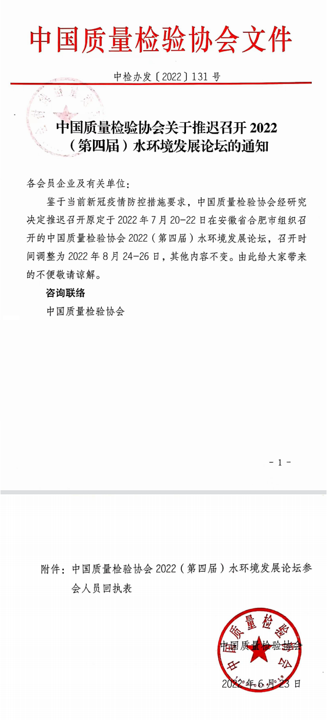 中國質(zhì)量檢驗(yàn)協(xié)會關(guān)于推遲召開2022(第四屆)水環(huán)境發(fā)展論壇的通知各會員企業(yè)及有關(guān)單位: 鑒于當(dāng)前疫情防控措施要求,中國質(zhì)量檢驗(yàn)協(xié)會經(jīng)研究決定推遲召開原定于2022年7月20-22日在安徽省合肥市組織召開的中國質(zhì)量檢驗(yàn)協(xié)會2022(第四屆)水環(huán)境發(fā)展論壇,召開時間調(diào)整為2022年8月24-26日,其...