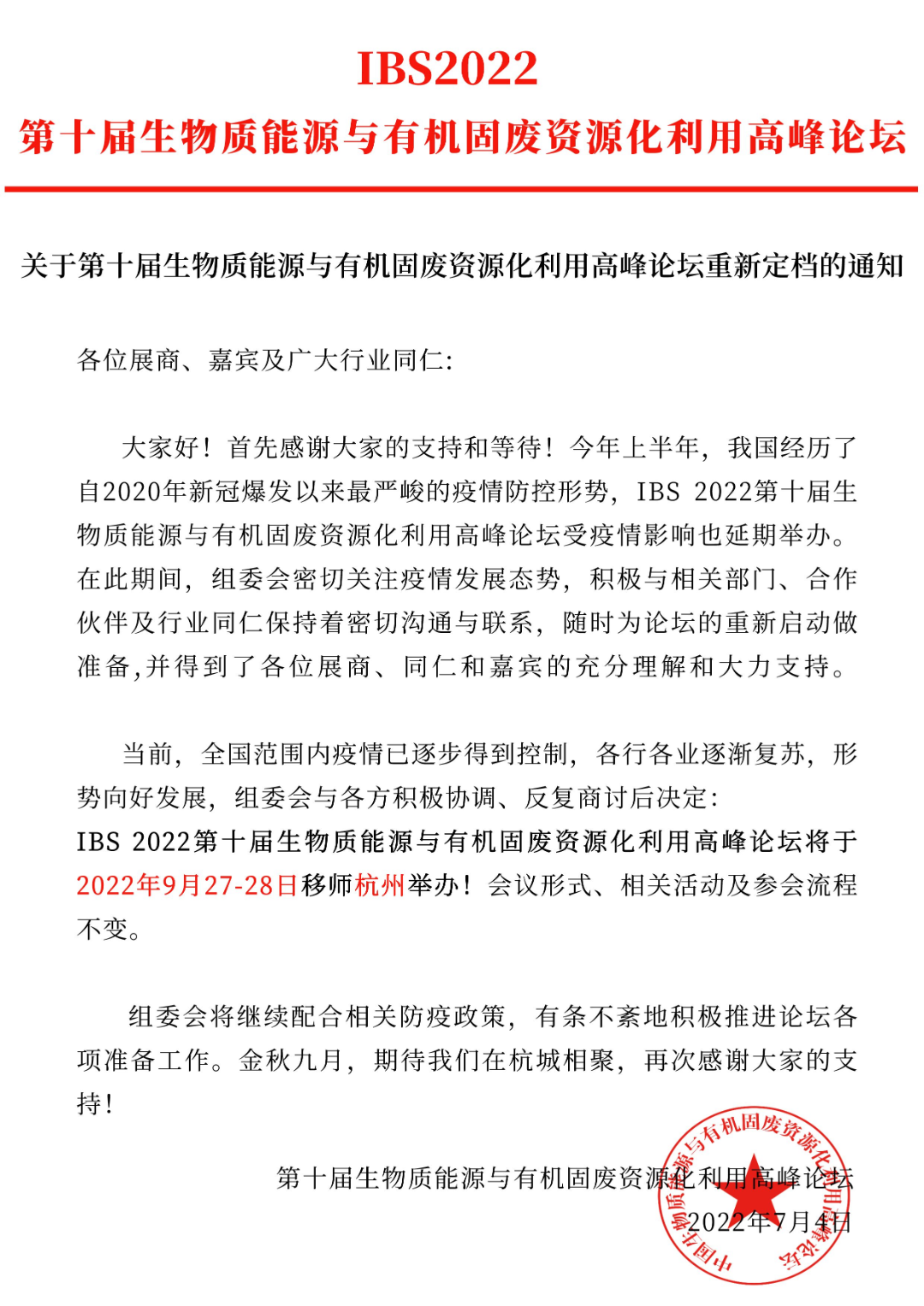 各有關(guān)單位、參會代表: 鑒于當(dāng)前疫情防控形勢仍較嚴(yán)峻復(fù)雜,為積極配合國家和地方防控要求,最大限度降低疫情傳播風(fēng)險,切實(shí)保障與會人員的健康安全,確保大會的質(zhì)量和效果,經(jīng)與各主辦單位協(xié)商決定:原定于2022年6月7日-9日舉辦的“2022鄉(xiāng)村振興與環(huán)境發(fā)展論壇、第二屆村鎮(zhèn)水環(huán)境治理產(chǎn)業(yè)與發(fā)展...