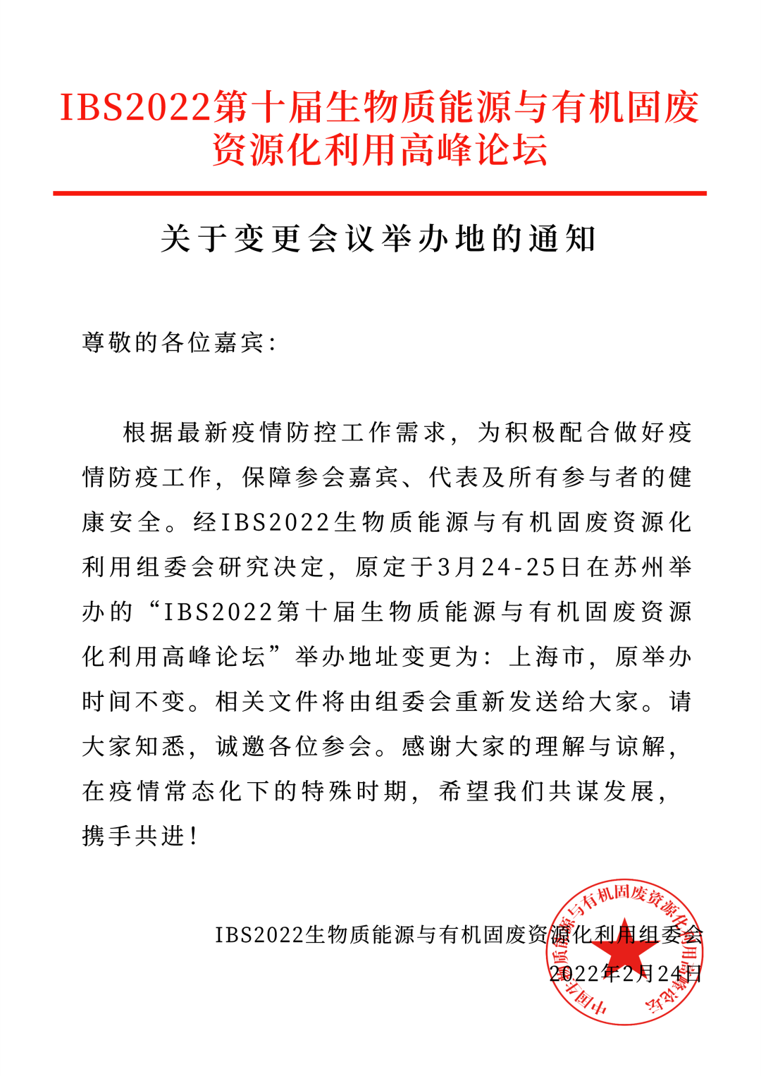 2月24日,IBS2022組委會發(fā)布通知,原定于3月24-25日在蘇州舉辦的“IBS2022第十屆生物質(zhì)能源與有機(jī)固廢資源化利用高峰論壇”舉辦地址變更為上海市,時間不變。 3月14日,IBS2022組委會再次發(fā)布通知,原定于2022年3月24-25日在上海舉辦的“...
