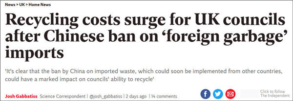 中國自今年1月起為配合新推出的環(huán)境政策,拒收大部分的外國紙類和,英國地方政府對此叫苦連天。根據(jù)調(diào)查發(fā)現(xiàn),因中國等國家決定不再回收來自外國的垃圾,造成2成英國地方政府只能自行救濟(jì)處理垃圾而造成預(yù)算吃緊。當(dāng)?shù)卣粲鯓I(yè)者,應(yīng)共同負(fù)擔(dān)激增的回收成本,并減少使用不易回收的包裝材料。據(jù)《英國獨(dú)立報(bào)》10月20...