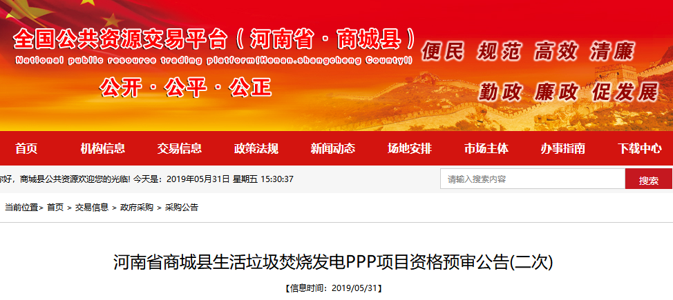 中國環(huán)聯(lián)網(wǎng)獲悉,5月31日,河南省商城縣生活垃圾焚燒發(fā)電PPP項目發(fā)布資格預(yù)審公告(二次)。項目概況及采購內(nèi)容項目名稱:河南省商城縣生活垃圾焚燒發(fā)電PPP項目;采購編號:商財采招字(2018)-147號;采購方式:公開招標(biāo) ;建設(shè)內(nèi)容:建設(shè)一座生活垃圾焚燒發(fā)電,一期工程規(guī)模600噸/日,配套一期工程...