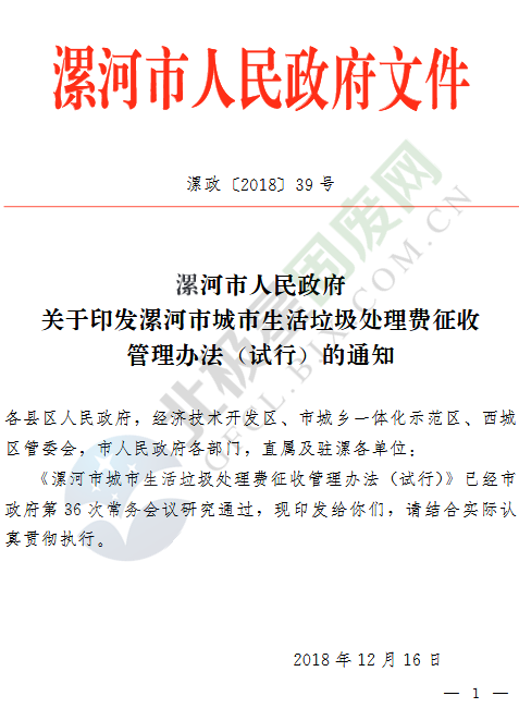 日前,《漯河市城市生活垃圾處理費(fèi)征收管理辦法(試行)》已經(jīng)河南漯河市政府第36次常務(wù)會(huì)議研究通過(guò),并于2019年1月1日起試行?!朵鸷邮谐鞘猩罾幚碣M(fèi)征收管理辦法(試行)》是對(duì)《漯河市城市生活垃圾處理費(fèi)計(jì)收管理暫行辦法》(漯政〔2005〕73號(hào))的完善修訂。具體內(nèi)容如下:漯河市城市生活垃圾處理費(fèi)...