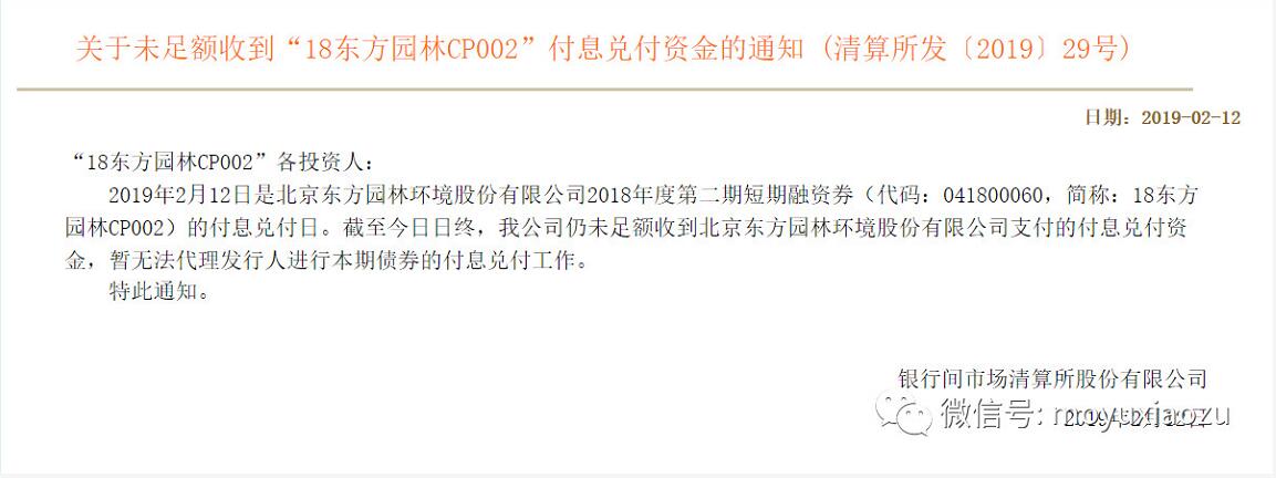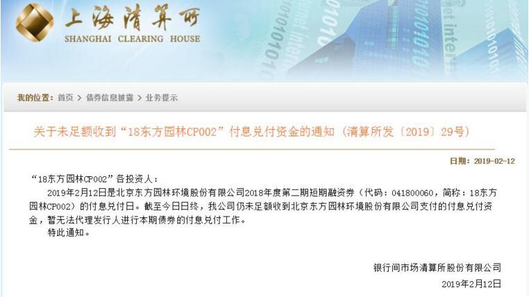 上海清算所2月12日晚間公告稱,未足額收到“18東方園林CP002”付息兌付資金,已經(jīng)實(shí)質(zhì)性違約。其中,18東方園林CP002本月12日到期,金額5億元,為去年2月發(fā)行,票面利率6%,期限一年。東方園林迅速回應(yīng)稱“我司已于春節(jié)前將5億本金匯至上清所賬戶,剩余3000萬(wàn)利息原計(jì)劃于近日匯出,但由于節(jié)后...
