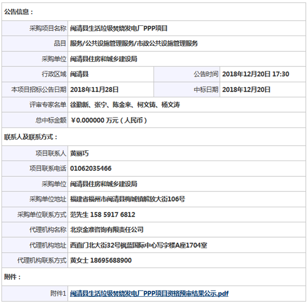 北京金準咨詢有限責任公司受閩清縣住房和城鄉(xiāng)建設(shè)局的委托,就“閩清縣生活垃圾焚燒發(fā)電廠PPP項目”項目(項目編號:JZXM-2018002)組織采購,評標工作已經(jīng)結(jié)束,中標結(jié)果如下:延伸閱讀:福建閩清縣生活垃圾焚燒發(fā)電廠PPP項目資格預審公告(第三次)閩清縣生活垃圾焚燒發(fā)電廠PPP項目資格預審(第二次...