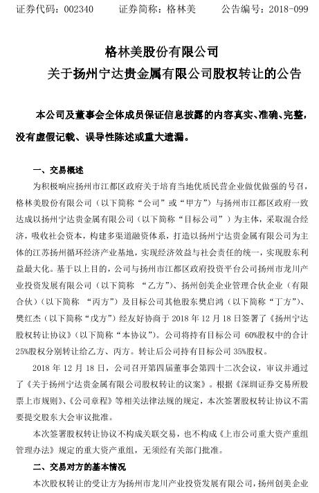 12月18日,格林美發(fā)布公告,公司將持有揚(yáng)州寧達(dá)貴金屬有限公司60%股權(quán)中的合計(jì)25%股權(quán)分別轉(zhuǎn)讓給揚(yáng)州市江都區(qū)政府投資平臺(tái)公司揚(yáng)州市龍川產(chǎn)業(yè)投資發(fā)展有限公司、揚(yáng)州創(chuàng)美企業(yè)管理合伙企業(yè)(有限合伙)。轉(zhuǎn)讓后公司持有目標(biāo)公司35%股權(quán)。揚(yáng)州寧達(dá)貴金屬有限公司主要從事鍺金屬回收、工業(yè)固體廢棄物填埋、電子廢...