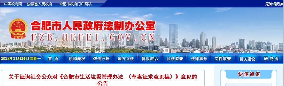 日前,合肥市發(fā)布了關于征詢社會公眾對《合肥市生活垃圾管理辦法 (草案征求意見稿)》意見的公告,詳情如下:為了提高立法透明度,充分聽取公眾的意見和建議,擴大政府立法的公眾參與,現(xiàn)將《合肥市生活垃圾管理辦法(草案征求意見稿)》全文向社會公布,公開征求公眾意見,期望廣大網友和有關單位積極發(fā)表修改意見和建議...
