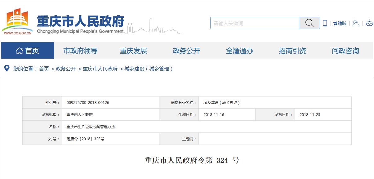 日前,重慶市政府發(fā)布了《重慶市生活垃圾分類管理辦法》,詳情如下:重慶市人民政府令第 324 號《重慶市生活垃圾分類管理辦法》已經2018年11月1日市第五屆人民政府第30次常務會議通過,現(xiàn)予公布,自2019年1月1日起施行。市 長 唐良智2018年11月16日(此件公開發(fā)布)重慶市生活垃圾分類管理辦...
