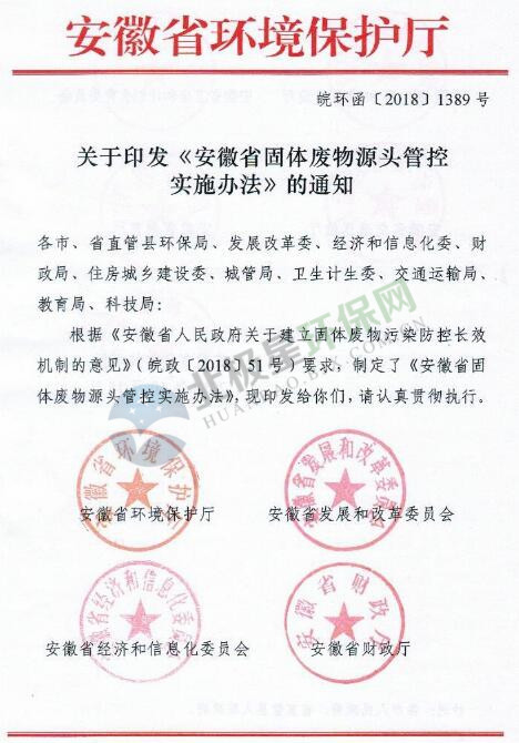 日前,安徽省發(fā)布《安徽省固體廢物源頭管控實施辦法》,詳情如下:關于印發(fā)《安徽省固體廢物源頭管控實施辦法》的通知各市、省直管縣環(huán)保局、發(fā)展改革委、經濟和信息化委、財政局、住房城鄉(xiāng)建設委、城管局、衛(wèi)生計生委、交通運輸局、教育局、科技局:根據(jù)《安徽省人民政府關于建立固體廢物污染防控長效機制的意見》(皖政〔...