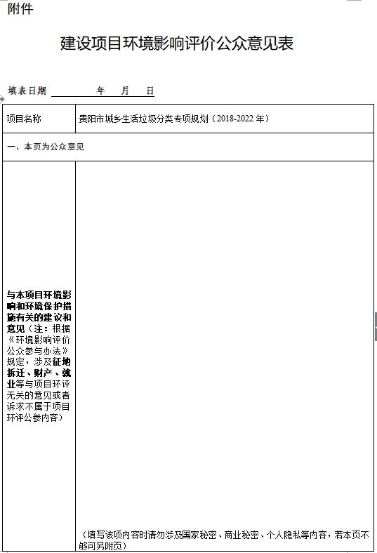 貴陽(yáng)市城鄉(xiāng)生活垃圾分類(lèi)專項(xiàng)規(guī)劃(2018-2022年)環(huán)境影響評(píng)價(jià)公眾參與信息公示根據(jù)《中華人民共和國(guó)環(huán)境影響評(píng)價(jià)法》、《環(huán)境影響評(píng)價(jià)公眾參與辦法》(生態(tài)環(huán)境部令 第4號(hào))規(guī)定,現(xiàn)就貴陽(yáng)市城鄉(xiāng)生活垃圾分類(lèi)專項(xiàng)規(guī)劃(2018-2022年)環(huán)境影響評(píng)價(jià)信息進(jìn)行第一次公示,歡迎公眾積極參與并提出寶貴意見(jiàn)。...