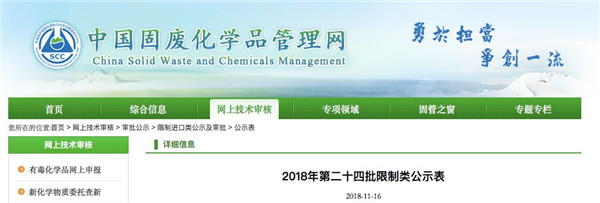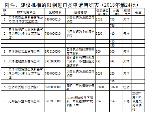 日前中國(guó)固廢化學(xué)品管理網(wǎng)發(fā)布了《建議批準(zhǔn)的限制進(jìn)口類(lèi)申請(qǐng)明細(xì)表(2018年第24批)》,其中涉及30家企業(yè)具體內(nèi)容如下: