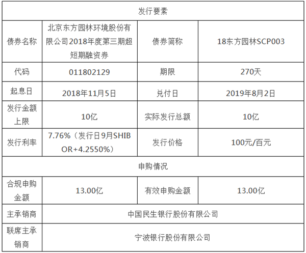 11月5日東方園林發(fā)布了《東方園林超短期融資券發(fā)行情況公告》,具體內(nèi)容如下:北京東方園林環(huán)境股份有限公司超短期融資券發(fā)行情況公告證券代碼:002310股票簡(jiǎn)稱:東方園林公告編號(hào):2018-163本公司及董事會(huì)全體成員保證信息披露的內(nèi)容真實(shí)、準(zhǔn)確、完整,沒有虛假記載、誤導(dǎo)性陳述或重大遺漏。北京東方園林...