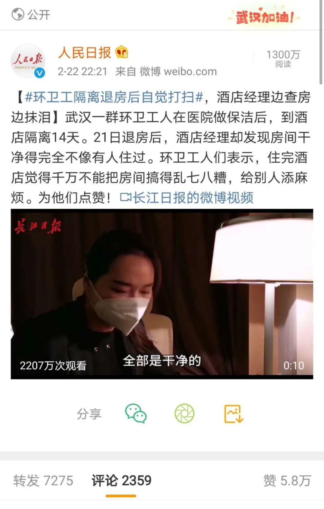“她們也許沒有讀過很多書,干著城市最臟最累的活,沒想到她們的心靈卻那么美好!”21日晚,沌口長江大酒店市場銷售部經(jīng)理程渝發(fā)的一條朋友圈引起大家的關(guān)注。退房后,環(huán)衛(wèi)工人自覺打掃酒店沌口長江大酒店住著武漢經(jīng)濟技術(shù)開發(fā)區(qū)的兩批環(huán)衛(wèi)工人。這群環(huán)衛(wèi)工因為之前在協(xié)和醫(yī)院西院保潔,出來必須要隔離14天。21日,環(huán)...