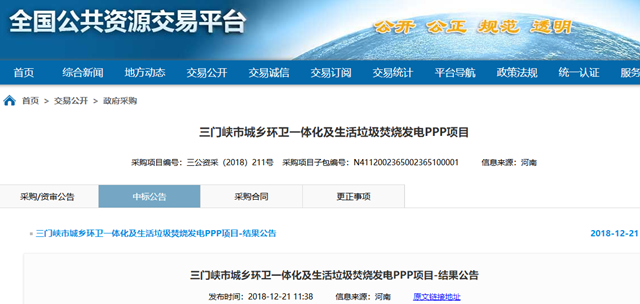 2018年12月21日,河南省三門峽市城鄉(xiāng)環(huán)衛(wèi)一體化及生活垃圾焚燒發(fā)電PPP項(xiàng)目發(fā)布結(jié)果公告,結(jié)果具體如下: 一標(biāo)段預(yù)中標(biāo)社會(huì)資本方: 單位名稱:北京環(huán)境有限公司(牽頭人)、北京中科仁和環(huán)??萍加邢薰?聯(lián)合體成員) 報(bào)價(jià)大寫:壹億零伍佰玖拾捌萬捌仟玖佰玖拾伍元叁角貳分每年 小寫:¥10598899...